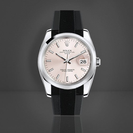 Vulcanized rubber strap which is precisely calibrated to fit the case and Oyster clasp of Rolex Oyster Perpetual 34mm (19mm lug Space), Date 34mm (19mm lug space) and Air King 34mm. This strap utilizes "Blocked Integration" engineering, incorporating solid inserts for a flawless, motionless flush mount to the Oyster Perpetual 34mm case.